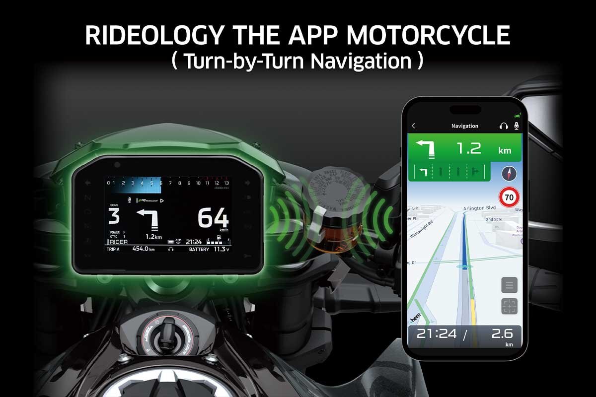 Full-colour TFT screen with digital speedometer, digital tachometer, gear position indicator, shift lamp, fuel gauge, odometer, dual trip meters, current and average fuel consumption, remaining range, average speed, total time, coolant temperature, clock, battery voltage, KQS, Electric Cruise Control, Kawasaki service reminder, oil change reminder, Riding Mode indicator, smartphone call and mail notices, smartphone battery level, headset, voice command status and riding log status indicators, RIDEOLOGY THE APP indicator, Economical Riding Indicator, and turn-by-turn navigation display; and lean angle indicator, acceleration/deceleration indicator, and maximum lean angle (on the Type 2 display)